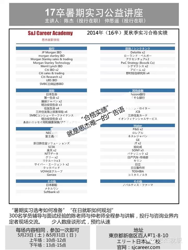 由顶尖投行人士所创办,全日本最专业,学员大手企业内定率最高的S&J Career Academy思杰就职学院,将在5月23日(六),5月31日(日)针对2017卒(现大三,修一)留学生展开在日暑假实习公益讲座。此次讲座中,有丰富【新卒採用】经验的投行业内人士会手把手帮助大家了解在日就职的全过程,更会为大家详细解析(投行,咨询,商社,maker,IT)五大最受留学生欢迎的行业,以及具体公司的选考流程和实习内容,帮助大家提前准备,在正选考开始之前便赢在起跑线上。