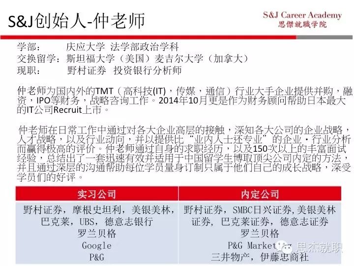 由顶尖投行人士所创办的留学生就职培训机构S&J Career Academy・思傑就職学院,作为日本第一家专业留学生求职培训机构,学院创办的三年来已累计辅导300名以上的中国人留学生拿到各大外资・日系大手企业的内定,并创下了日本金融业中国人内定者垄断等极佳的实绩与口碑。S&J的金牌讲师阵容完全由中国人社员&内定者构成。S&J深知在日就活中,中国人和日本人的不同。坚守以留学生的视角出发,教授留学生如何与日本人在就职中竞争是我们的核心理念。S&J的讲师们毫无悬念的代表了在日本就职中最优秀的中国人内定者&社员。实力超群的讲师阵容以及作为日本第一家专业留学生就职培训机构累积的教学经验是S&J于其他最大的差别,是我们的核心竞争力,也是我们的学员能有如此出类拔萃实绩的根本原因。其中在2014年正选考中创造了金融、商社行业的垄断实绩,更是有众多出身校不高的同学上演了逆袭的好戏。